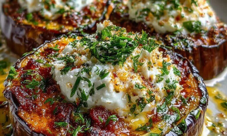 Greek Moussaka-Style Roasted Eggplant with Tangy Feta Cream